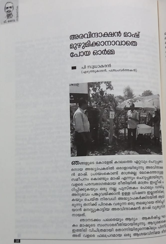 മാഷുടെ ക്ലാസ്സില് ഇരിക്കാന് ഞങ്ങള്ക്ക് ഒരുപാട് കാരണങ്ങള് ഉണ്ടായിരുന്നു. പാഠപുസ്തകത്തിനപ്പുറമുള്ള ചിന്തകള്ക്ക് വലിയ ഇടമൊന്നും ഇല്ലാത്ത അന്നത്തെ പഠനരീതിയില് എം എം നാരായണന് മാഷും അരവിന്ദാക്ഷന് മാഷുമൊക്കെ പാഠപുസ്തകത്തിനപ്പുറമുള്ള വെളിച്ചം കണ്ടെത്താന് വിദ്യാര്ത്ഥികളെ സഹായിച്ചവരാണ്. ഭാഷയെ സ്നേഹിക്കാന് മാഷ് പഠിപ്പിച്ചു. ഒരു നല്ല അദ്ധ്യാപകന് ഒരു നല്ല മനുഷ്യന് കൂടി ആവണം എന്ന് മാഷ് ഉറച്ചു വിശ്വസിക്കുകയും തന്റെ നിലപാടുകളിലൂടെയും പ്രവര്ത്തികളിലൂടെയും അത് വ്യക്തമാക്കുകയും ചെയ്തിരുന്നു. ആരുടേയും ഗുരുവാകാന് ശ്രമിക്കാതെ മാഷ് തന്റെ തൊഴില് ചെയ്തു, യാതൊരു അവകാശവാദവും ഇല്ലാതെ.